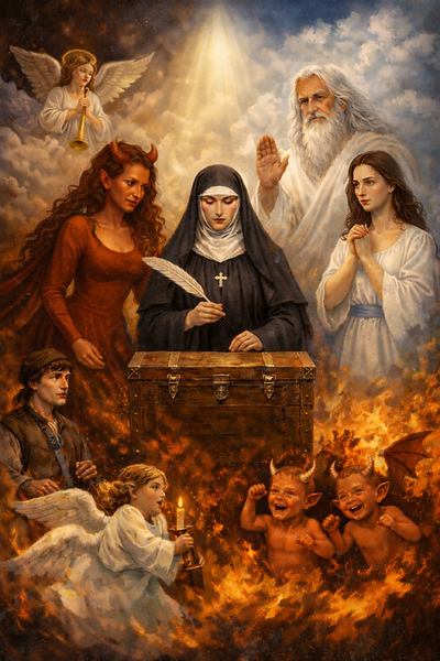 Vad händer när ett gammalt stall i Nordtyskland förvandlas till en himmelsk rättssal? När Djävulen själv väcker åtal – och Kristus leder rättegången? När änglar och demoner bråkar